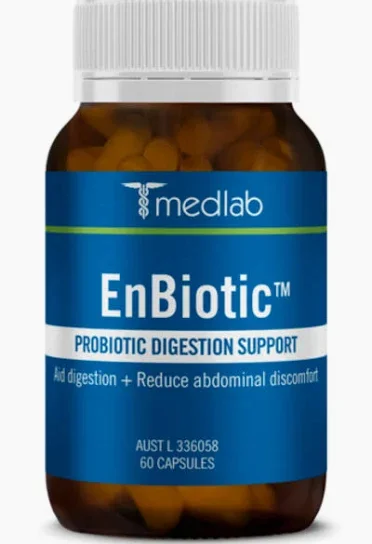 EnBiotic - is a digestive enzyme and multi-strain probiotic formulation. EnBiotic™ contains 241.6 mg of plant and fungal-derived digestive enzymes and 8.75 billion CFU (colony-forming units) of bacteria per capsule. This combination may support digestive function of dietary fats, proteins and carbohydrates and assist in the management of indigestion, altered bowel habits and gastrointestinal discomfort. EnBiotic™ may also assist in managing the symptoms of Irritable Bowel Syndrome. ARTG Listed Medicine - Flyer